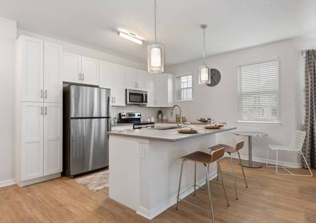 Access our apartments easily by elevator or attached garage. Once inside, you will find chef-inspired kitchen features sleek, stainless steel appliances for the cook of every skill level, as well as a modern kitchen island ideal for dining and entertaining. Quartz countertops bring your kitchen an air of sophistication, and an in-home washer and dryer make laundry day an absolute breeze.